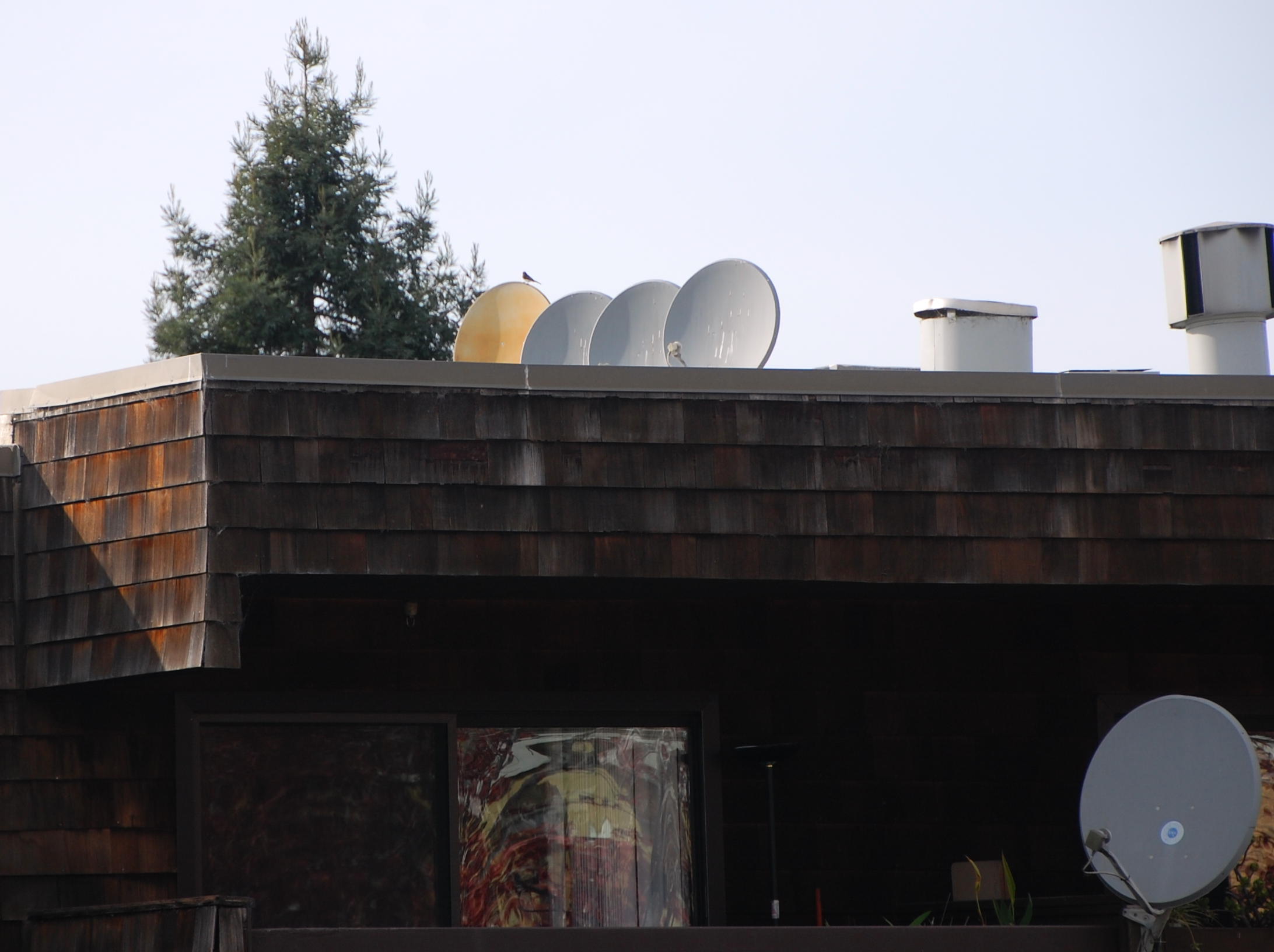 It was just to be a photo of the multiple antenna dishes, with the prominent one looking, maybe at a different satellite, but then something happened: a bird on the only one that isn’t gray, leading to the tree in the background (it’s a redwood tree, and the shingles on the building seem to be redwood), and then the image in the window seems to be receiving all the signals and making a distorted image.