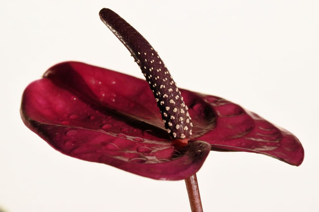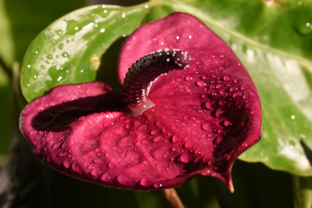 Taking care of plants this week-end… After a visit at Planterday, I learned about this Anthurium that had been abandoned outside my apartment and that I had “rescued” to decorate a corner of the passageway… As it’s getting colder, it would be wiser to move it indoors, so I replaced it with a Flowering Maple that is more of an outside plant! Then I cleaned the Anthurium and the sun was setting on it, so I took some pictures: